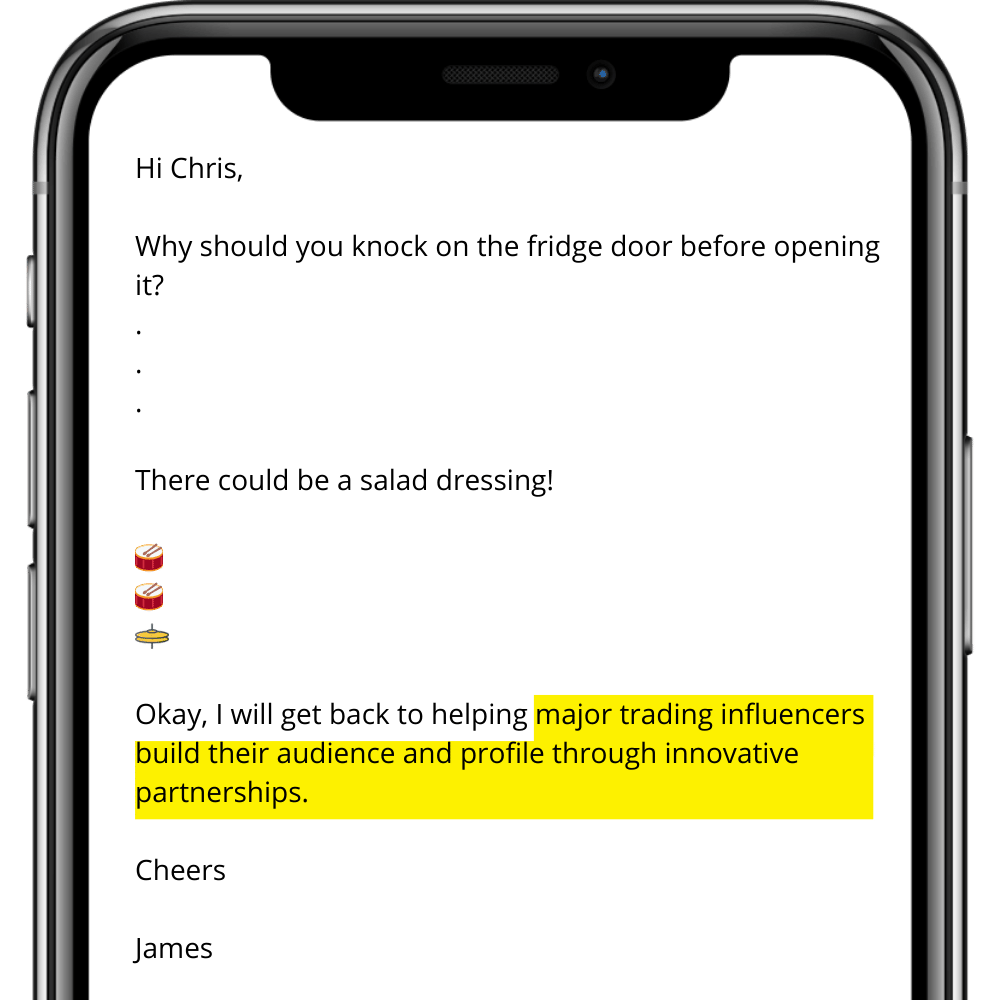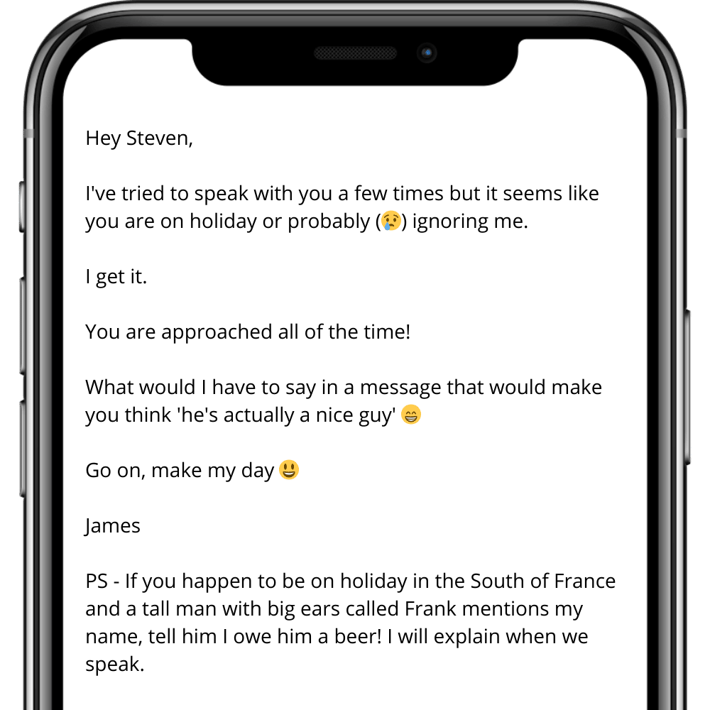 In today’s edition, we explore why humour is so important to opening doors and building relationships in sales. It has to be used at the right time, but when you do, then wow… Let’s get to it Hello Reader, I remember the day well. I had been on the phone trying to generate new leads for my software business for around 2 hours with limited success. I had made over 50 calls, and for the 20 or so people I had got to speak with (it was easier getting hold of people 15 years ago!!), they weren’t interested in what we had to offer. I had resigned myself to it just being one of those days, but on the next call, something happened. I can’t quite remember why I decided to change my approach, but when the person picked up the phone, I said: "Hi, is that [Name]? You are the 51st person on my list to call today and you probably don’t want to be interrupted, but I wanted to talk with you about something important. If you give me a few seconds, I will tell you one of my best jokes. If it makes you smile, you hear what I have to say. If it doesn’t, you can end the call there." The guy at the end of the phone chuckled and said, "go on then". I was shocked but grabbed the opportunity. "What do you call a lady who sets fire to all her important letters?" He replied, "I don’t know". “Bernadette”. I waited for a few seconds and then heard him laugh down the phone and say, "Fair play, that’s good! You win". And the ice had been broken. I then proceeded to talk about the software we had and what I thought it could do for him, and although he wasn’t totally interested, he heard me out. The pitch I had then wasn’t as good as what I teach people to do now, but that’s not the key point here. He was open to listening as I had made him smile. It opened the door. Humour had won, and ever since that day, I have made sure to use it as much as I can in sales conversations. Not all of the time, of course. There is a time and a place to try and bring humour into the conversation, and you have to be VERY careful about what humour you use. What you may find funny is not what someone else will, so stay away from jokes related to sex, race, politics and religion! What I aim to use are statements which can provoke a smile. In a call, I may say, "The last thing you want right now is someone calling you, I know. So before I go home and cry, would you give me a minute to share why I called?" Or "You don’t know me, and you are probably wishing you hadn’t answered, but you did. So were connected, and so there are 2 choices. One is you give me 30 seconds to share some incredible wisdom, or two, you end the call and make me open up a new pack of tissues to wipe away my tears. Which option are you going for?" Now the key is HOW you deliver this message. With the right tone and delivered in a calm but engaging way, this type of approach can break down barriers and open doors. If you don’t have phone numbers, then you can use messages (like the ones below) on email or through social media DMs. Obviously, you should change the bit highlighted to be more about what you do. Humour, when used in sales, works! It breaks the ice. It relaxes people, and it gives you time. When you have met people, adding humour to conversations also builds relationships and brings people closer to you. I will cover this in another email if you drop me a message to say this email helped you. I read all replies. So, have a think about how you can use humour. Focus on trying to make people smile in prospecting conversations, and you could be amazed by the impact it has. Have a brilliant week ahead, and remember: Eat or be Eaten. James How would you rate this edition? 🤏🏻 So-So |